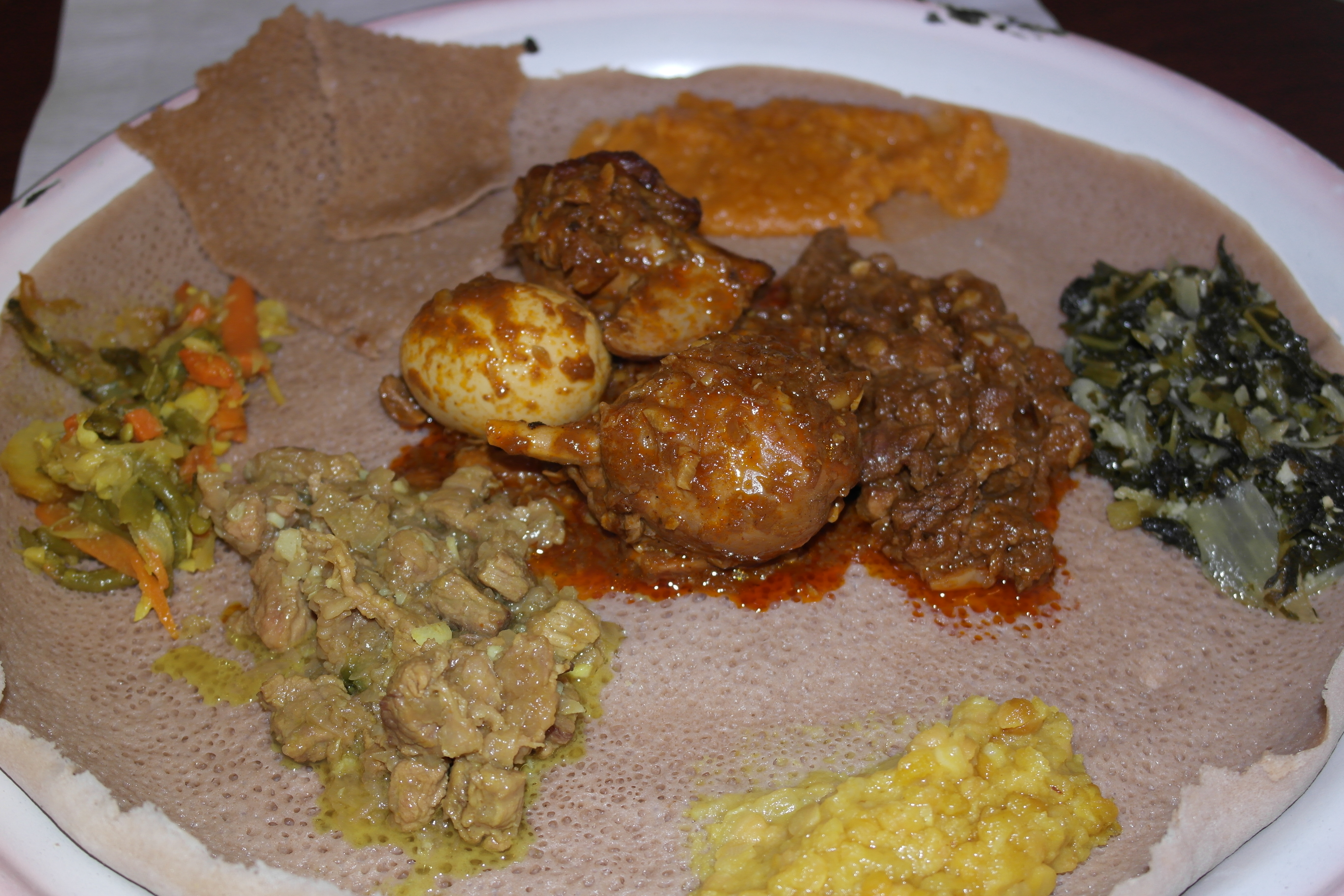 We stopped by on a quiet weekday and took our seats in the newly remodeled dining area. Comfortable and decidedly not modern with animal accents and tourism posters but still pleasant to my senses. We ordered the Abyssinia Special I for two which consists of Doro We’t, Yebeg We’t, Tibs Alicha and Spinach Gomen (by our request). Even though that is a good haul of food by itself the combo also comes with 3 vegetable based sides including Yatakilt We’t, Mesir We’t and Kik Alicha and a big basket full of rolled injera to grab at all the stews.