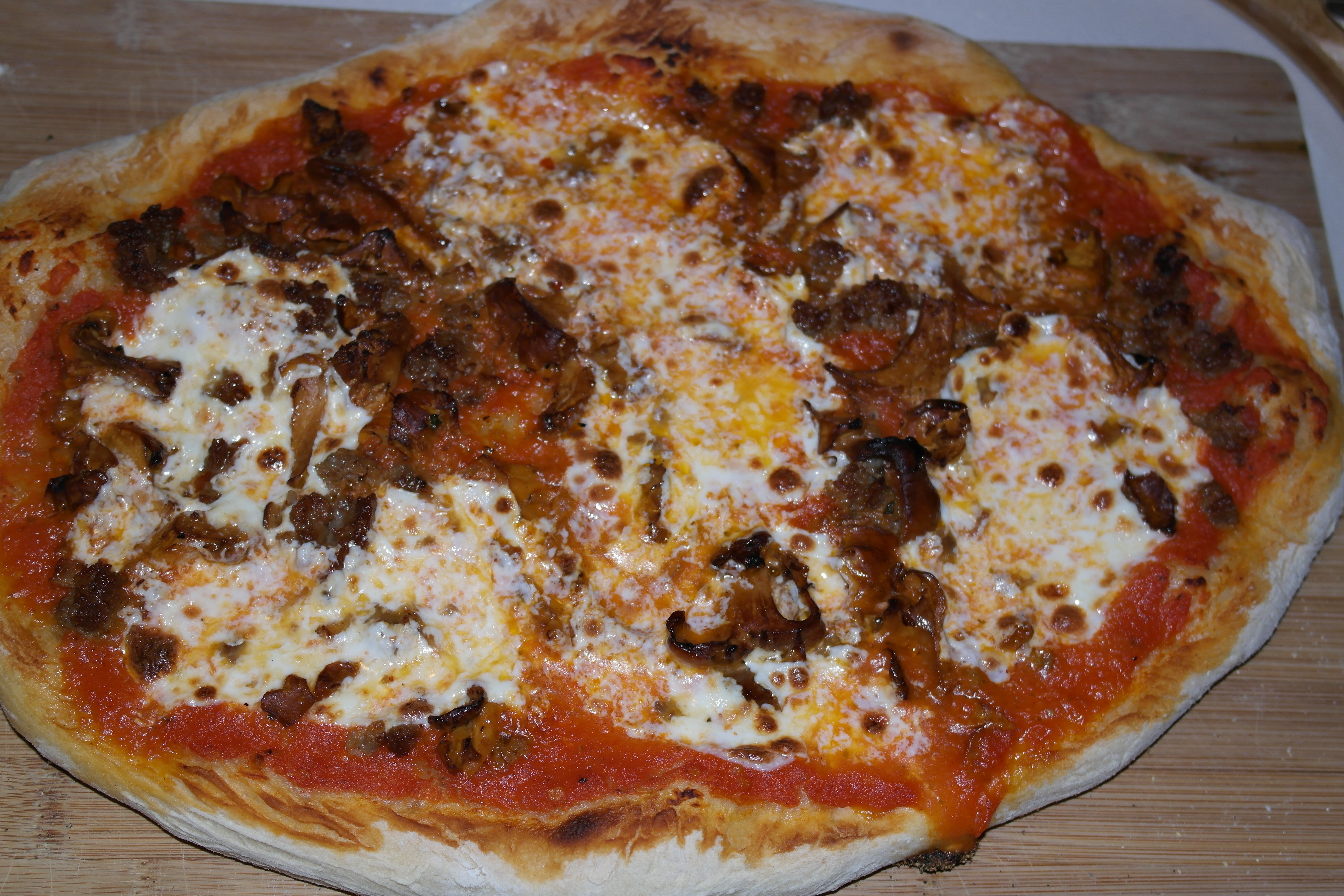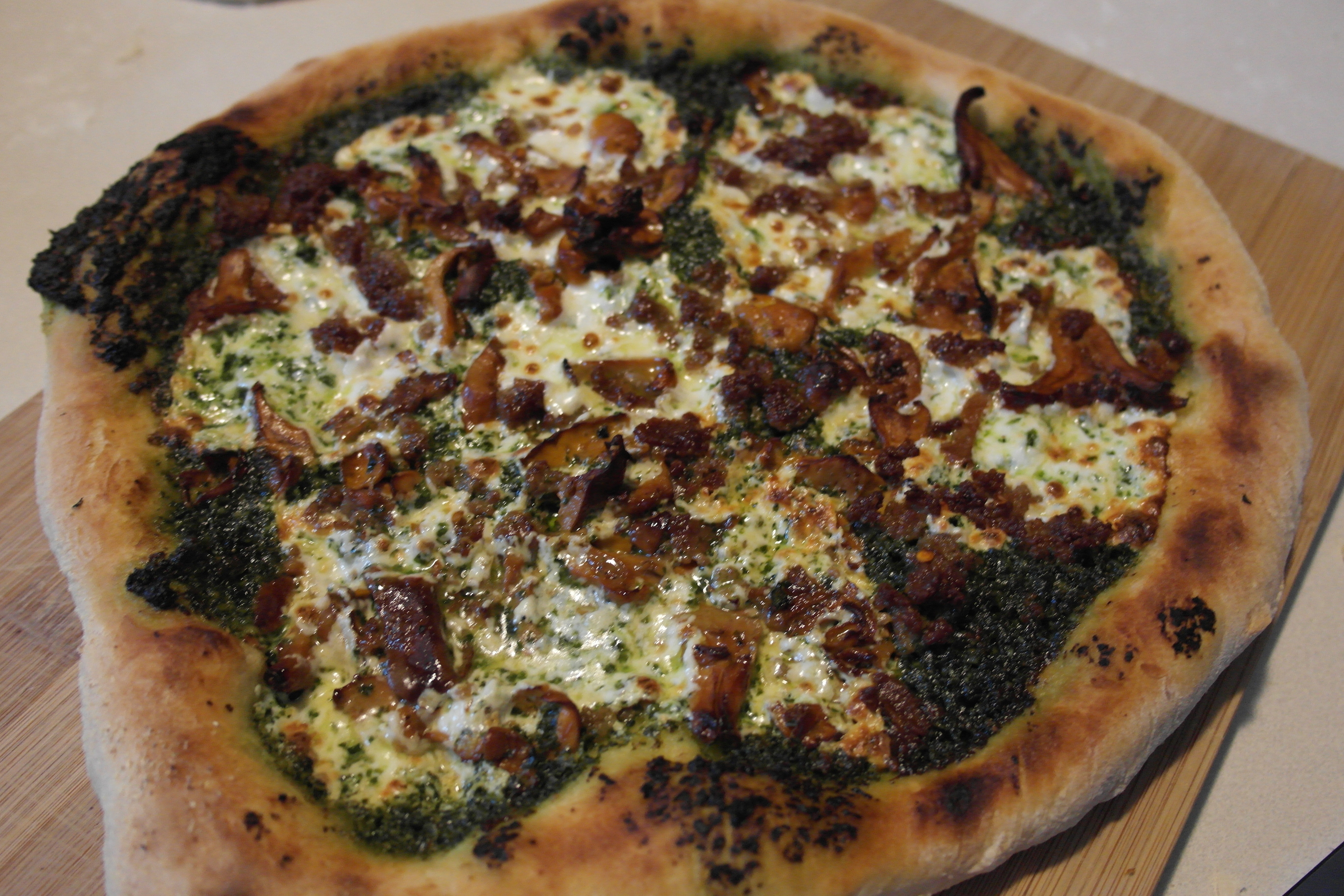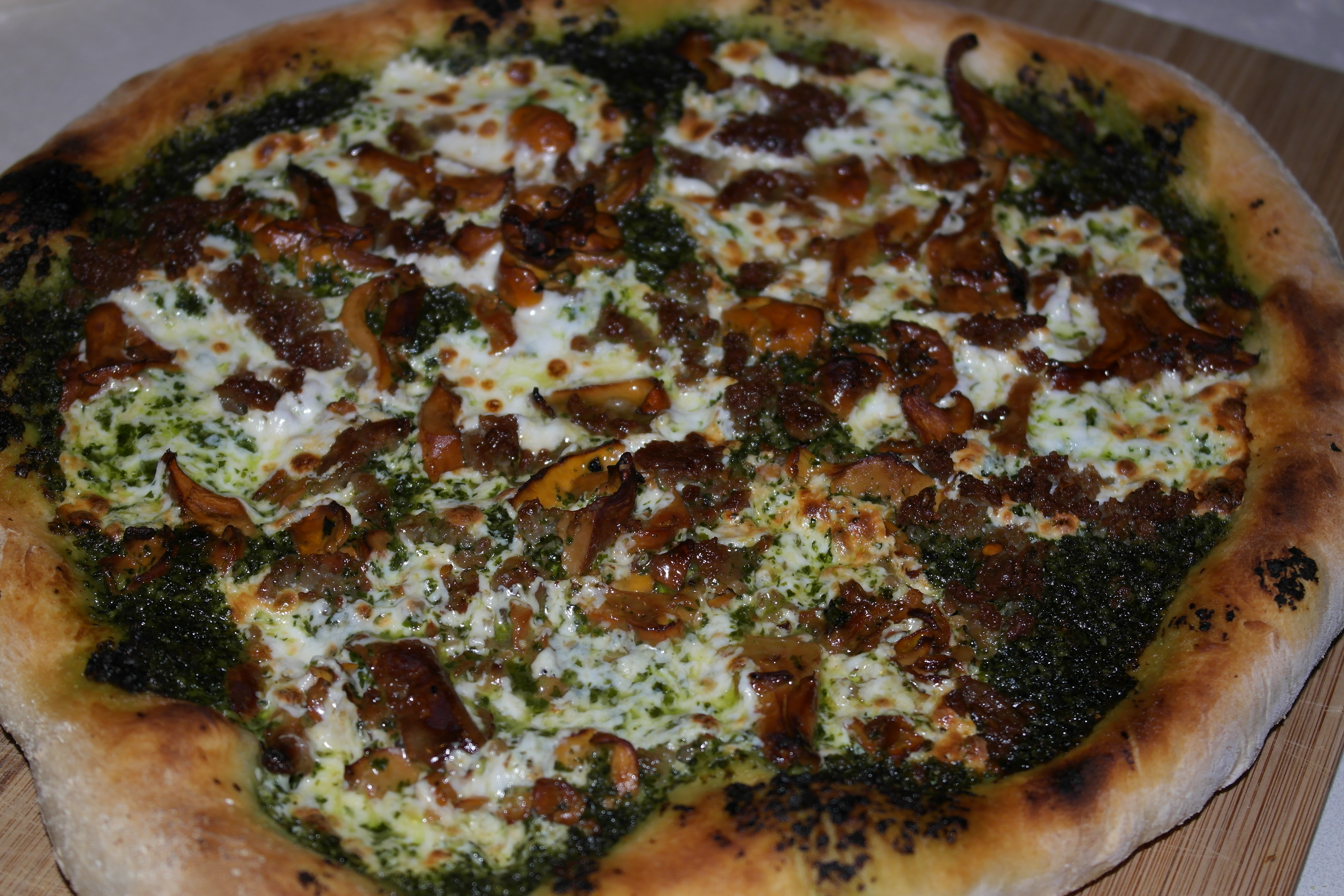 The chanterelle mushrooms were cooked with garlic, salt and sausage fat after cleaning and being chopped into bite size pieces. The chanterelles and sausage went on both pizza styles and the only variable was the sauce type. Each pie was constructed with sauce, fresh mozzarella cheese, mushrooms and sausage chunks.