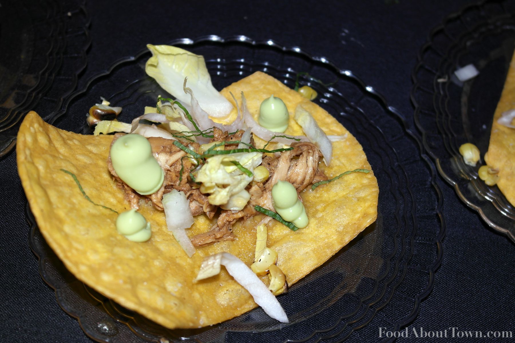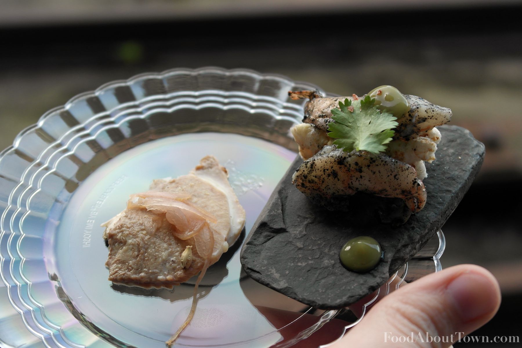 The first of which was poached shrimp lightly coated with burnt nori (seaweed), a kaffir lime matcha gel, and a crunchy rice puff served on a flat stone meant to be skipped on the water that was next to the event. The shrimp were tender and the burnt nori added an interesting charred dimension that I enjoyed. The gel had a bit of citrus and a lot of green tea flavor. Entertaining presentation, a tasty dish and on the same table was the beef tongue preparation. I’m a huge fan of beef tongue and this was some exceedingly tender, fall apart tongue served with a barley flavored yogurt and pickled shallots. I would have preferred a touch more salt to cut through the richness of the tongue and the tangy yogurt, but still successful regardless.