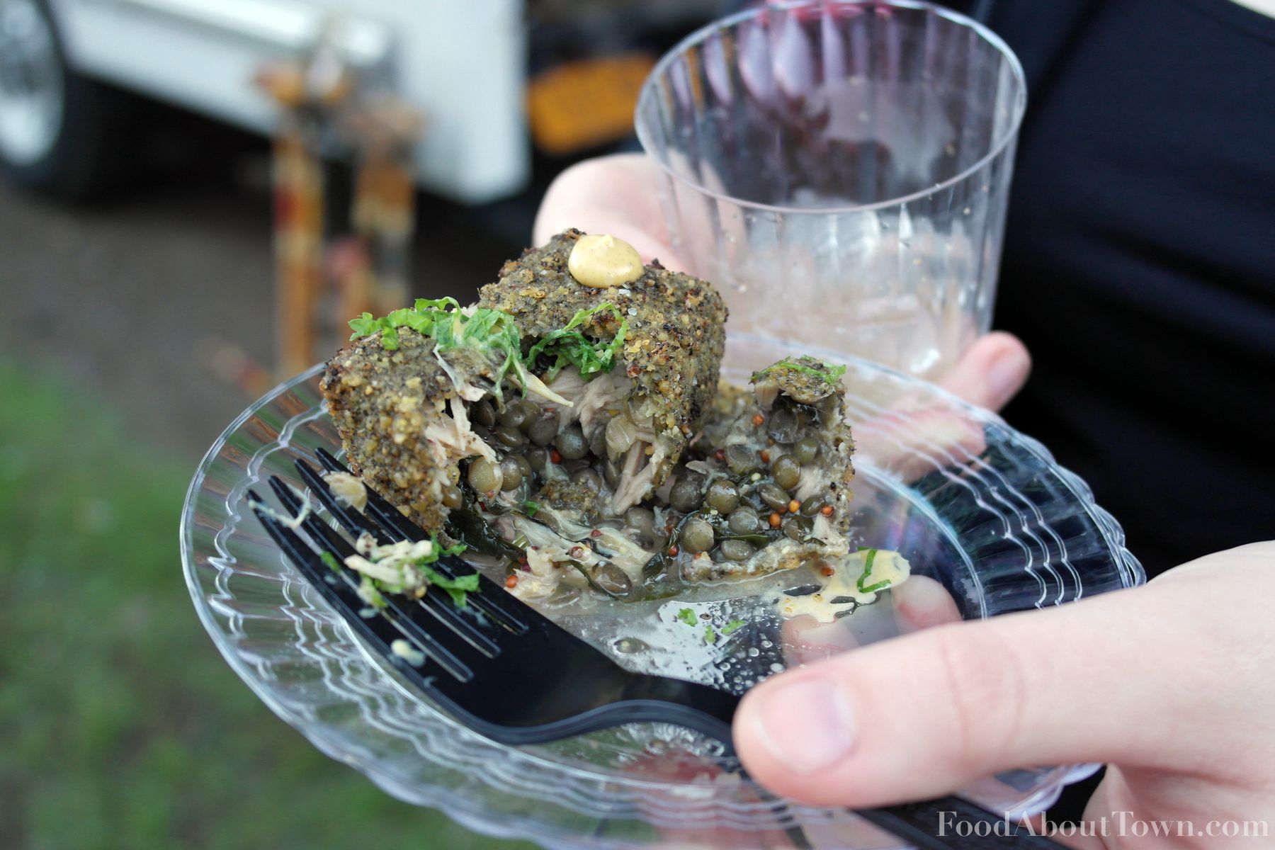 Our warm appetizer was the first dish cooked on site and the setup they were able to whip up was pretty impressive. A small bank of deep fryers was setup to cook the raw lentil block shaped croquette that was filled with a mustard broth and perfectly cooked rabbit and puy lentils and topped with a small amount of finely cut mustard greens. Definitely my favorite of the appetizers and it hit every note I love with the perfect amount of mustard and salt for me and the whole thing kind of reminded me of a giant French lentil soup dumpling in the best possible way. This was high end restaurant food cooked in an outdoor setting and that was an impressive feat to say the least.