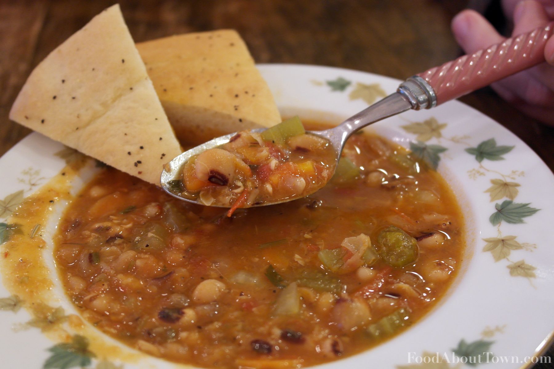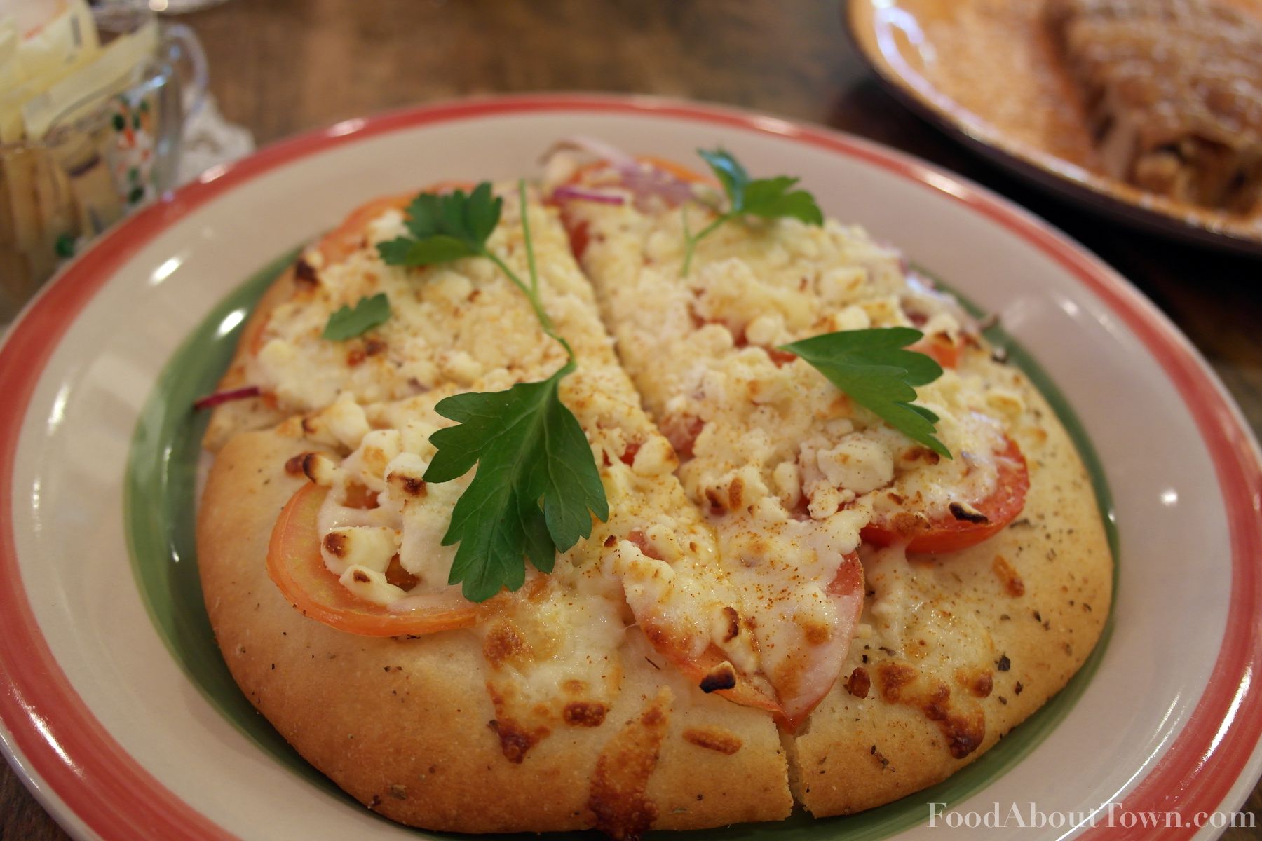 Later in the week, we made a stop in for our first non-brunch meal at Voula’s after Carrie got excited about the specials that were posted on Facebook for the evening. We got three items off that list to split up for our meal including a soup, a pizza and a semi dessert, semi main course to finish things off. The soup was a hearty bean (black eyed pea I think) and veggie filled affair with a clean tasting tomato broth and plenty of mirepoix flavor. Probably could have used a bit more seasoning but the soup was obviously homemade and brought a lot to the table that I enjoyed.
