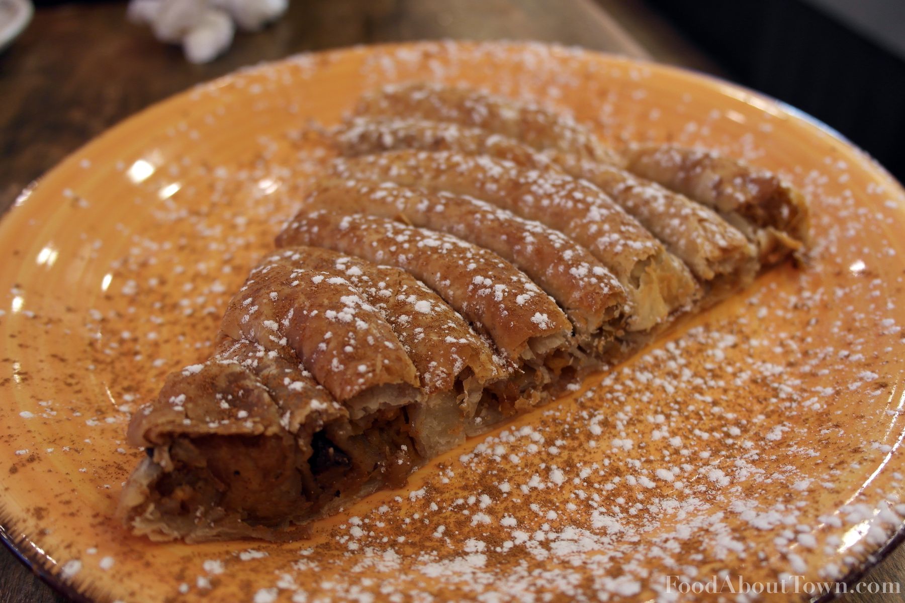 The “pizza” was more of a flatbread with a crust that was similar to a crisped up lagana bread topped with melted cheese, feta and tomatoes along with red onions, although none on my side since I’m not a big fan of them. I enjoyed the simple flavors of the flatbread for what they were and mostly left it at that. I’d like to see some fresh garlic kick or some more flavorful tomato slices, but it was still tasty. Last course of the evening was a large slice of a squash filled pastry with a name that was extraordinarily long and difficult to pronounce and a hit at the table.