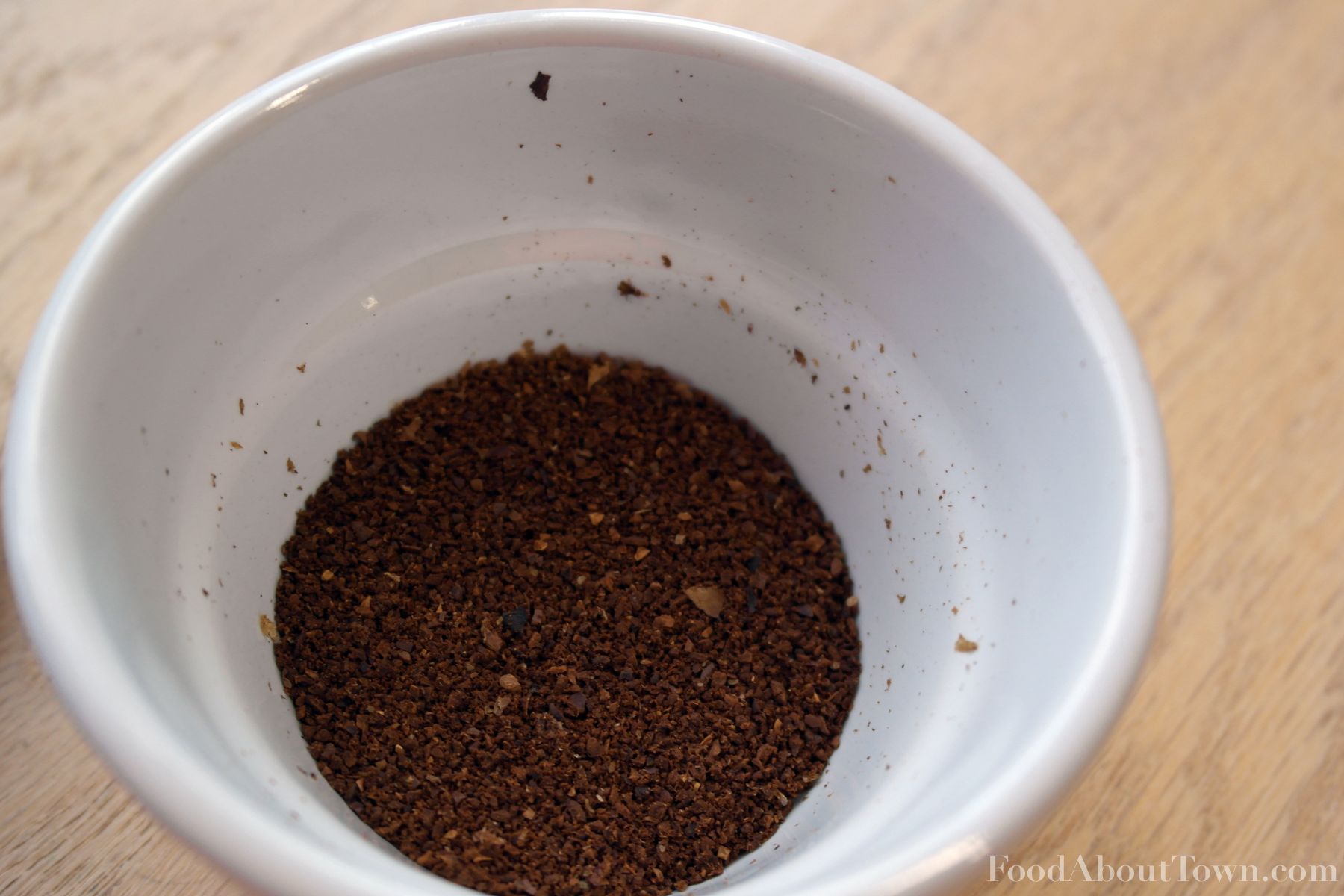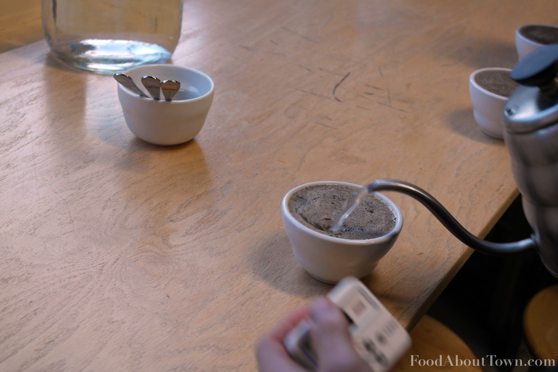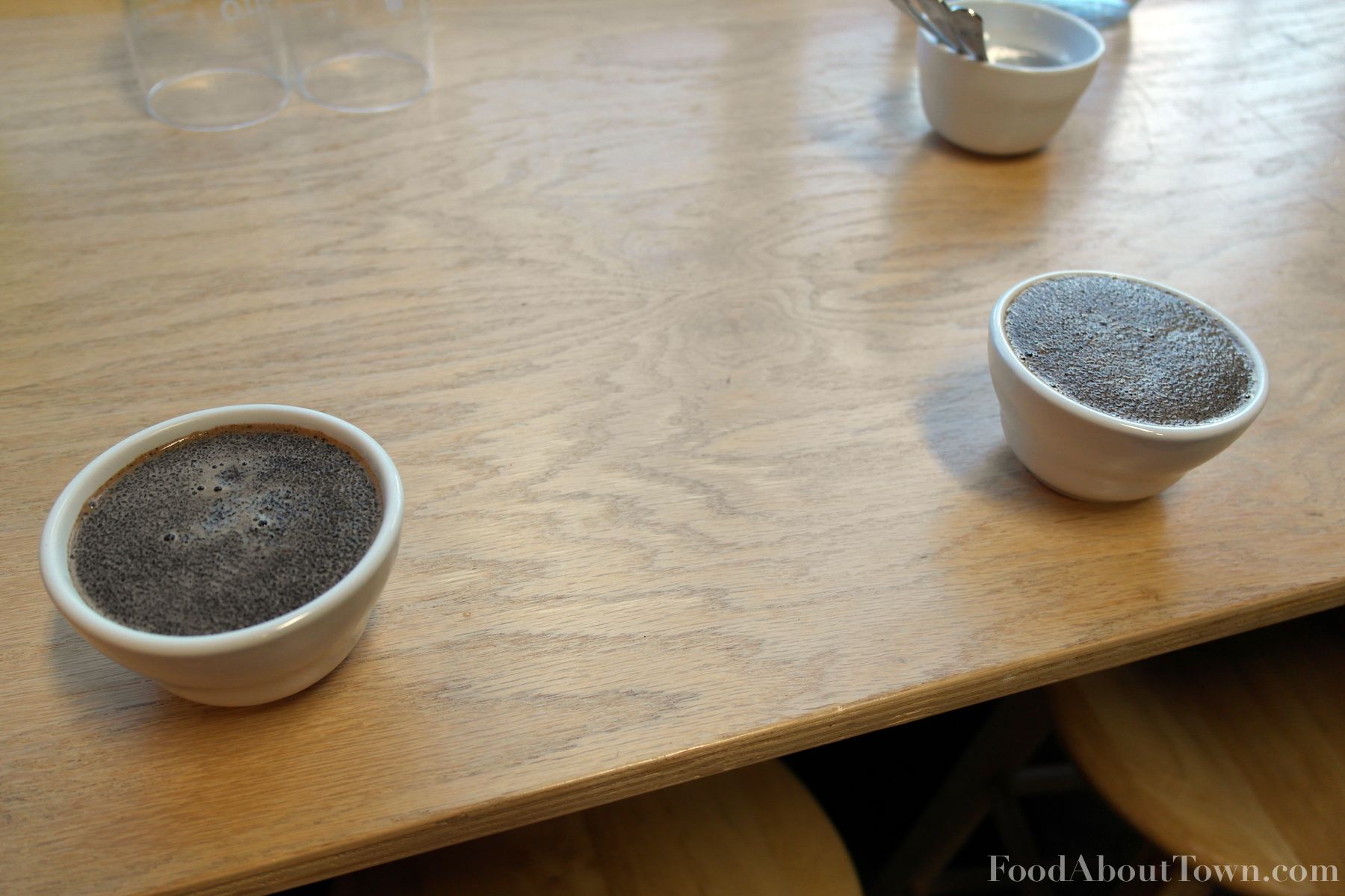 The first part of the cupping involved Wade grinding a small amount of beans for each person of the two coffees and placing them in a small cup (see pictures) where we would smell them and try and identify whatever we thought we smelled. We were supposed to get as close as possible to the grounds and, with a slightly open mouth, sniffing strongly and then just throw out anything we could smell. Following the dry round, hot water was added to the grounds and they floated to the top of the cup and then we did a second round of smelling. Different compounds open up after being exposed to the hot water so some smells were intensified and some came out for the first time.