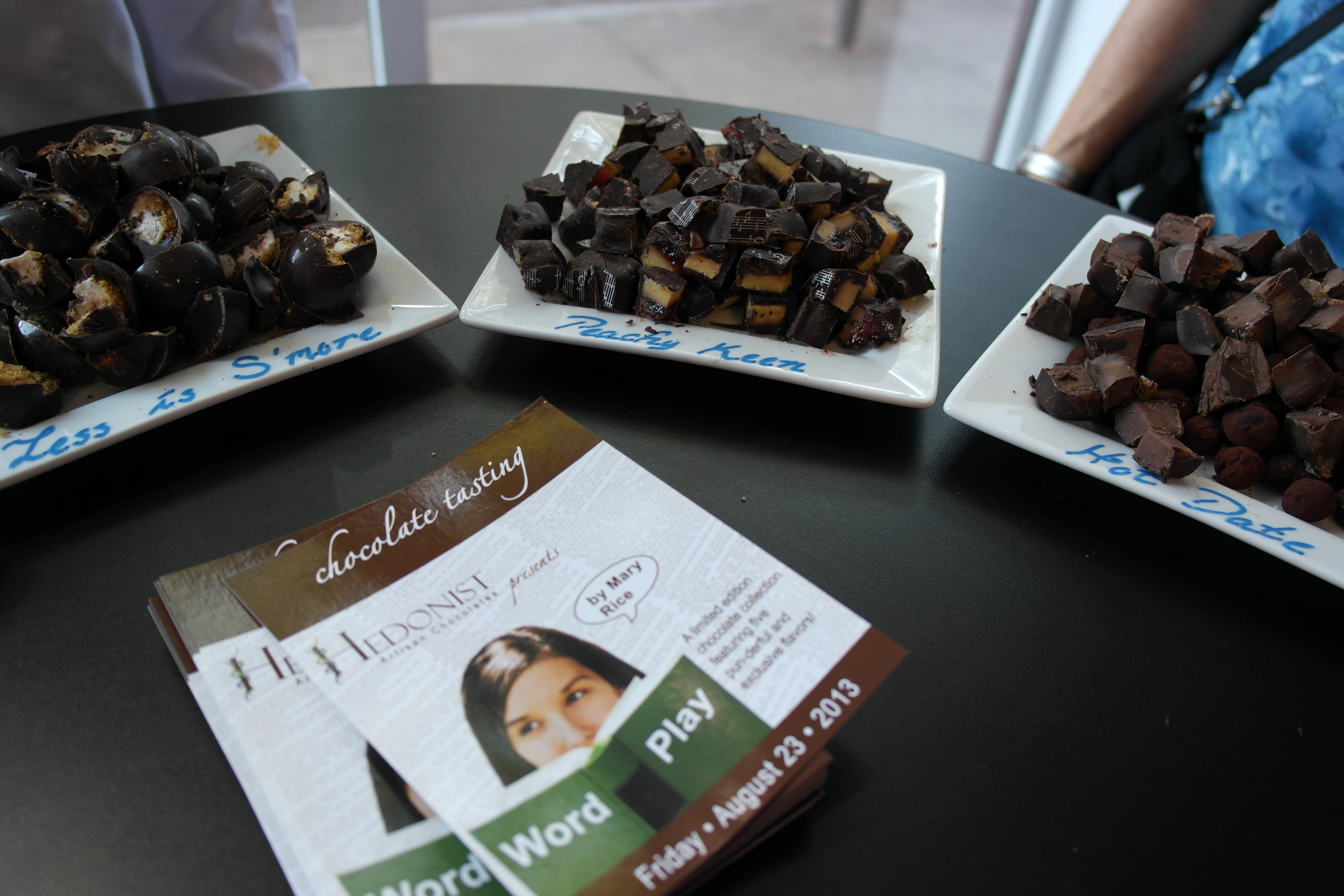 More creative options were the Less is S’more that aimed to give the s’more experience in a smooth domed bittersweet truffle with homemade marshmallow and graham crust inside and the Peachy Keen that offered dense peach jam balanced out by some nougat (if I remember correctly) that reminded of the traditional raspberry jam filled truffle but with significantly more balance. The most adventurous of the bunch was the Hot Date with a dark chocolate exterior, a smooth date flavored chocolate interior and topped with habanero sugar crystals. I’m not usually one for dates but their density worked well with the filling and the assertive but not overwhelming heat acted like a palate cleanser to finish off the sampling. I enjoyed the flavors enough to buy a box to share with my fiancée at home and she dug the flavors almost as much as I did. The Word Play collection is still available at Hedonist in pre made box sets or by individual pieces if you want to give them a try!