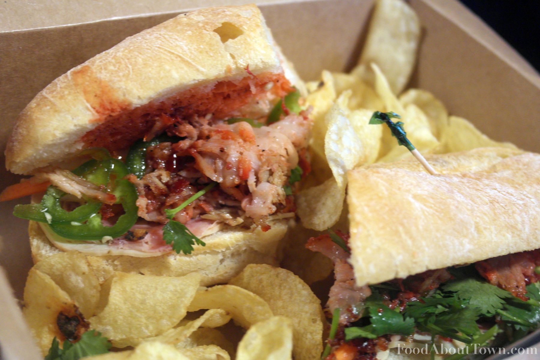 Let’s start where we left off with the banh mi sandwich from the debuting Bento Box truck. Although other trucks like Marty’s Meats often have banh mi on the menu, I was pleased to see a truck focused on them specifically. They only had one variety on the menu that offered a mostly traditional look at the sandwich with the pork roll, head cheese and a BBQ pork belly as the meat components. The big downfall of this sandwich was that the roll was on the stale side and much too tough and there wasn’t enough of the pork belly to justify the overall cost. That’s not to say that everything was bad since the flavor of the BBQ char siu style pork belly was quite good but the overall sandwich could use some improvement.